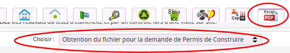 Etape 1 : à la fin de vos saisies, dans le dernier onglet Recap PDF, champ Choisir, sélectionnez Obtention du fichier pour la demande de Permis de Construire. A ce stade, vous devez avoir préalablement effectué un calcul rapide puis précis du Bbio et obtenu un Bbio inférieur au Bbio Max, aucun message d’erreur lors de ce calcul, et avoir lu et compris les avertissements éventuels. C’est ce résultat du Bbio, calculé par le logiciel Perrenoud U22Win, qui fait foi car établi avec un logiciel évalué par le CSTB. Si ce Bbio obtenu est supérieur au Bbio max, vous devez repartir sur l’optimisation du bâti. |